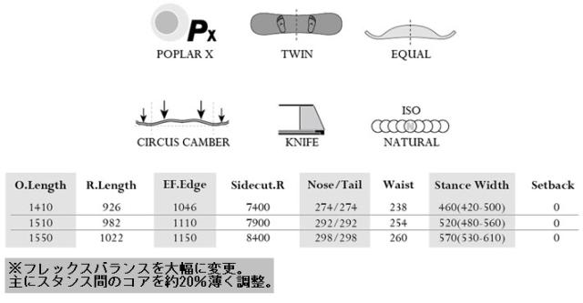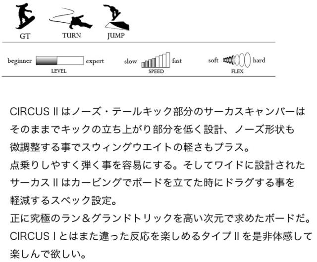 そしてワイドに設計されたCIRCUS2はカービングでボードを立てた時にドラグする事を軽減するスペック設定。