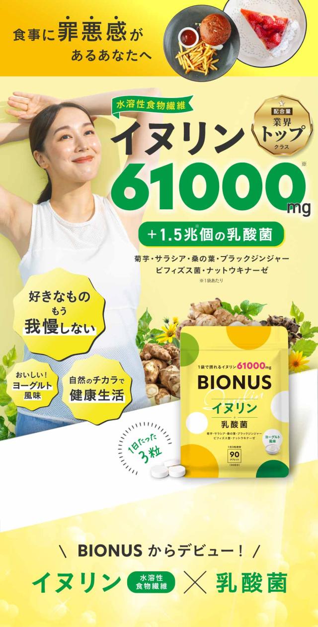イヌリン サプリ ビオナス 61,000mg 乳酸菌入り ヨーグルト風味 タブレット 1日3粒 90粒 30日分 菊芋 ビフィズス菌 オリゴ糖 ナットウキナーゼ 桑の葉 ブラックジンジャー