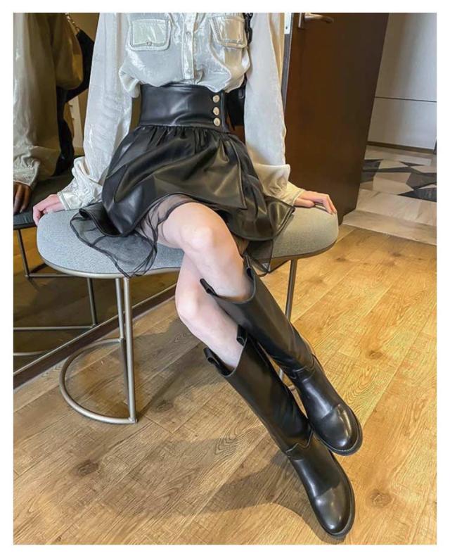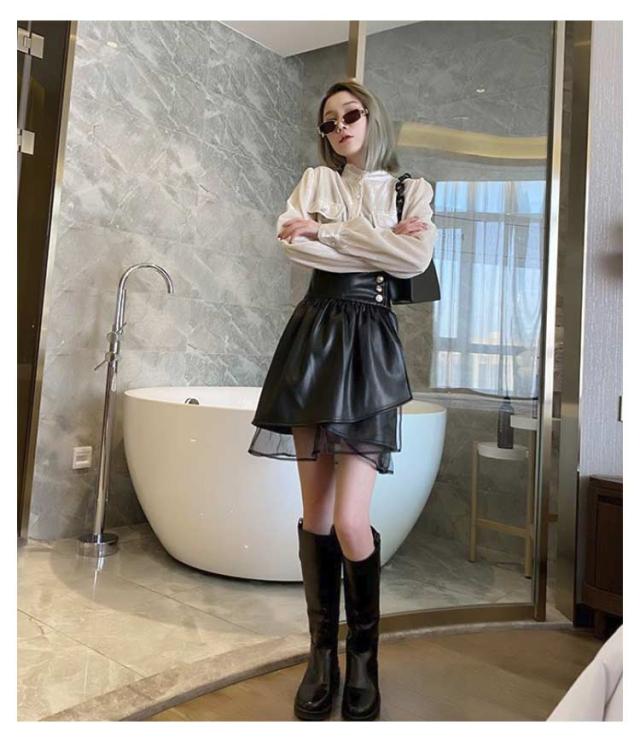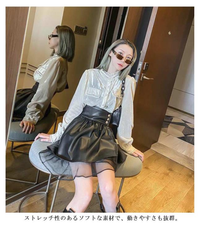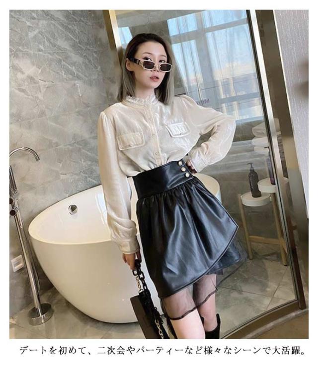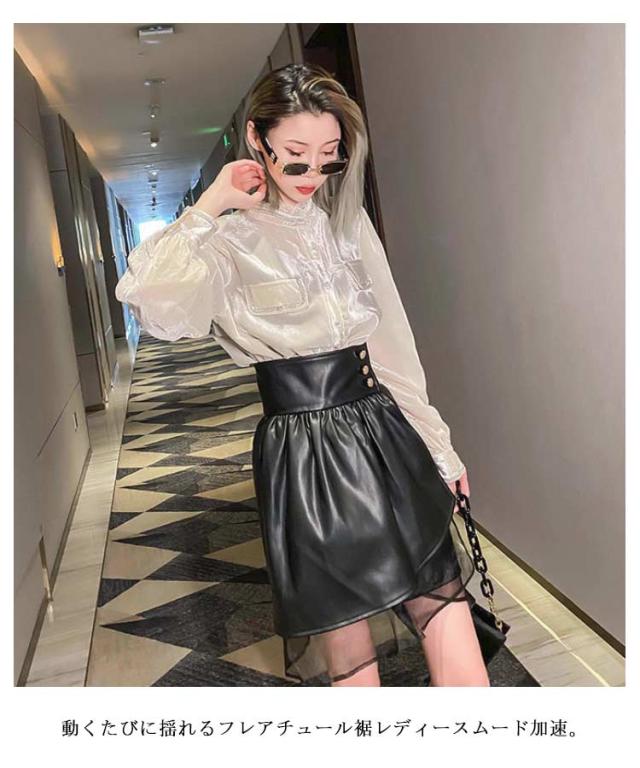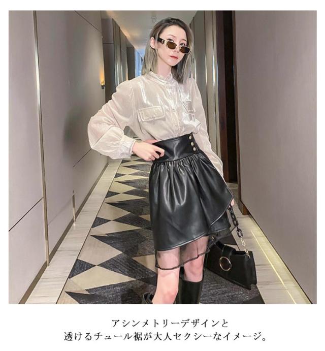 レディース 美シルエット PUレザー フェイクレザー チュール切替 タイト スカート レザースカート レザー レザー ミニスカート ハイウエスト アシンメトリー ペンシルスカート ショート丈 着?せ
