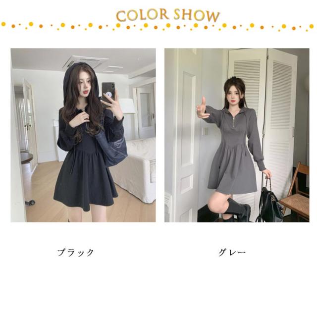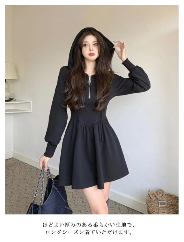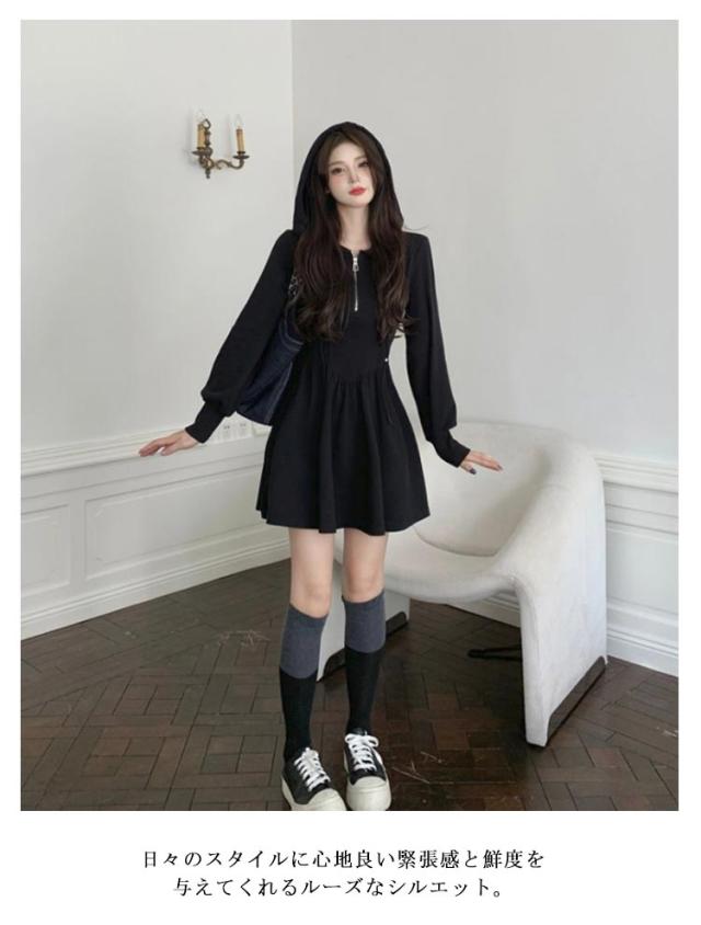 ミニワンピース トレーナー レディース フード付き パーカーワンピース 長袖 ハーフジップ パーカー スウェット ウエストシェイプ タック Aライン 楽ちん パーカーワンピース スウェットワンピース ブラック