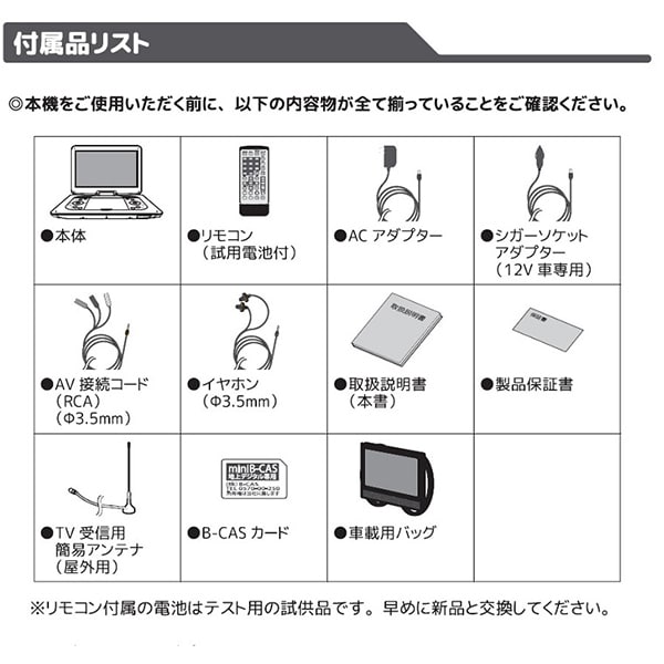 ■付属品:リモコン・イヤホン・ACアダプター・シガーソケットアダプター・車載用バッグ・AV接続ケーブル・miniB-CASカード・簡易アンテナ・取扱説明書・保証書