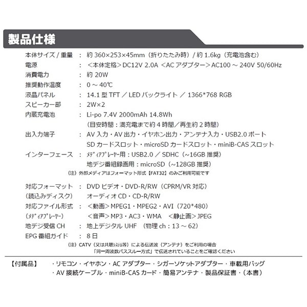 ■本体サイズ:(約)360×253×45mm(折りたたみ時)/約1.6kg ■付属品:リモコン・イヤホン・ACアダプター・シガーソケットアダプター・車載用バッグ・AV接続ケーブル・miniB-CASカード・簡易アンテナ・取扱説明書・保証書 【ご注意】 ・シガーソケットアダプターご使用の場合:本製品はDC12Vバッテリー仕様の自動車専用となっております。 ・TV受信用簡易アンテナについて:本製品付属のアンテナは屋外用の簡易アンテナです。ブースター等は非搭載のため、設置場所によっては受信(視聴)できない場合があります。 ・地上デジタル放送の視聴について:ケーブルテレビ局(CATV)から伝送されているアンテナをご利用の場合、CATVからの伝送方式によってはテレビ番組の視聴ができません。同一周波数(UHF)パススルー方式にのみ対応。 ※記載は商品仕様の一部です。仕様説明不足等の理由での返品はできません。特に適合等は必ずご確認ください。