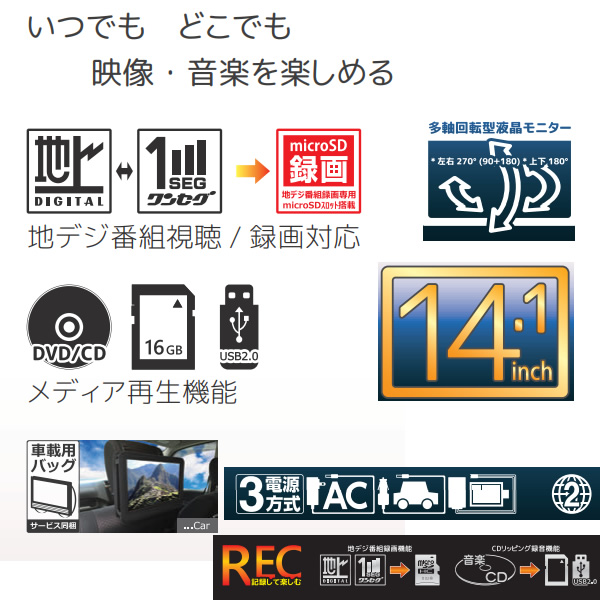 14.1インチ録画機能付 フルセグポータブル DVDプレーヤー