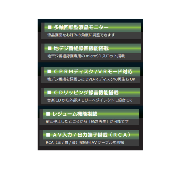■対応フォーマット:DVDビデオ・DVD-R/RW(CPRM/VR対応) (読込みディスク)オーディオCD・CD-R/RW