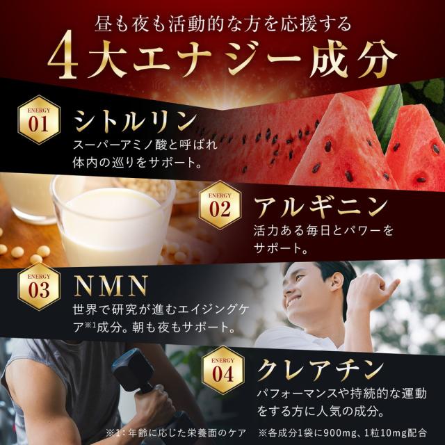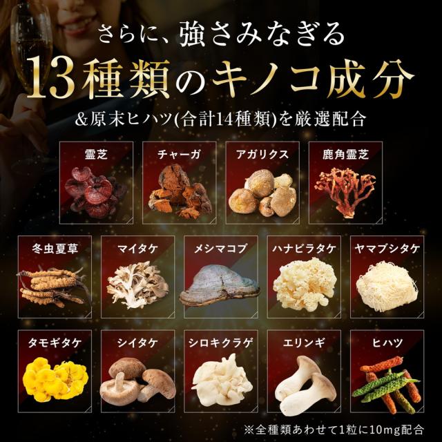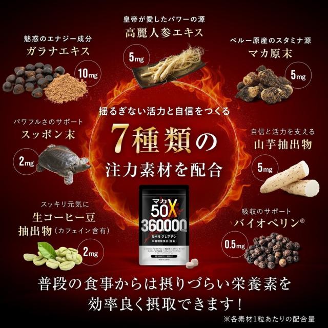 マカエキス末(国内製造)、還元麦芽糖水飴、L-シトルリン、β-NMN(ニコチンアミド・モノヌクレオチド)、クレアチン、キノコミックスパウダー(霊芝粉末、エリンギ粉末、アガリクス粉末、鹿角霊芝粉末、冬虫夏草粉末、チャーガ粉末、マイタケ粉末、メシマコブ粉末、山伏茸粉末、ハナビラタケ粉末、タモギタケ粉末、シイタケ粉末、シロキクラゲ粉末、ヒハツ粉末)、ガラナ粉末、マカ、オタネニンジン抽出物(デキストリン、オタネニンジンエキス)、ヤマイモ抽出物、スッポン粉末、生珈琲豆抽出物、黒胡椒抽出物/結晶セルロース、グルコン酸亜鉛、L-アルギニン、微粒二酸化ケイ素、ステアリン酸カルシウム(一部にヤマイモを含む)