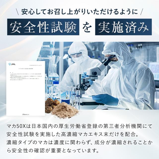 原料となるマカエキス末は国内の第三者機関で安全性試験済みのものだけを使用