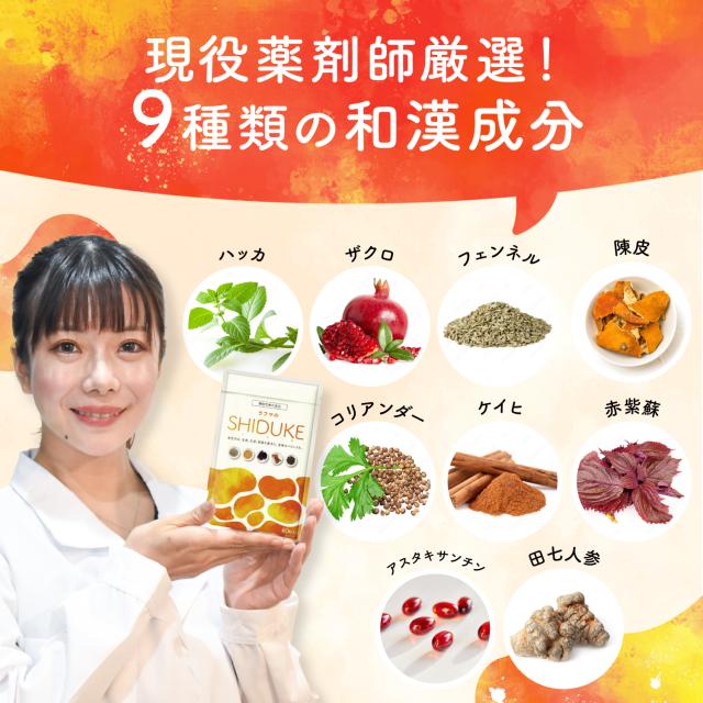 GABA末(中国製造)、アグニ乾燥エキス末(アグニ抽出物、デキストリン)、ラフマ葉抽出物、ケイヒ抽出物(デキストリン、ケイヒエキス)、陳皮末、乾燥赤しそ末(赤しそ、漬け原材料(食塩、しそ悔酢))、コリアンダー末、フェンネル末、ザクロエキス末(デキストリン、ザクロ果汁)、田七人参末/セルロース、ステアリン酸カルシウム、ピロリン酸第二鉄、微粒酸化ケイ素、チャ抽出物、lーメントール、加エデンプン、ヘマトコッカス藻色素、ビタミンB1、ビタミンB2、ビタミンB6、葉酸、ビタミンB12、微粒酸化ケイ素、酸化防止剤(ビタミンE)