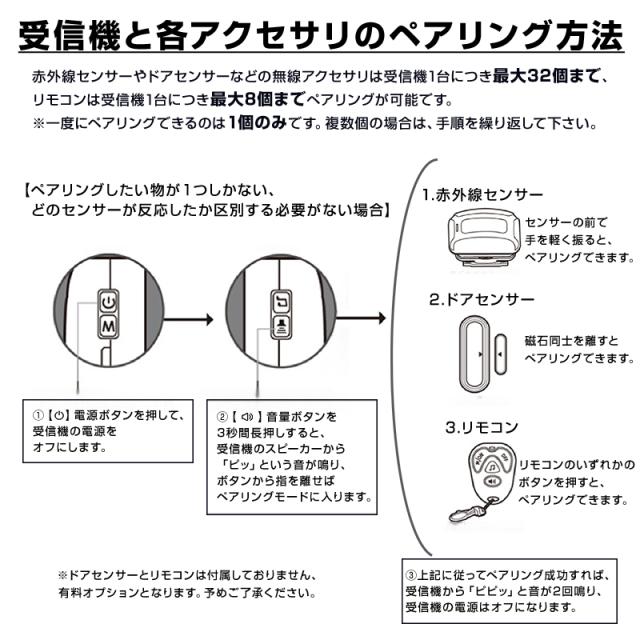 受信機2個と赤外線センサー1個の、お得な屋内用ワイヤレスチャイムセットです。