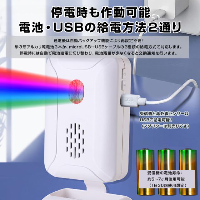 乾電池またはUSB給電式。停電時のペアリング再設定不要。