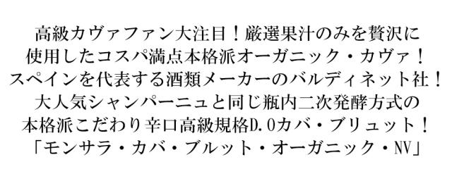 高級カヴァファン大注目!厳選果汁のみを贅沢に 使用したコスパ満点本格派オーガニック・カヴァ! スペインを代表する酒類メーカーのバルディネット社! 大人気シャンパーニュと同じ瓶内二次発酵方式の 本格派こだわり辛口高級規格D.Oカバ・ブリュット! 「モンサラ・カバ・ブルット・オーガニック・NV