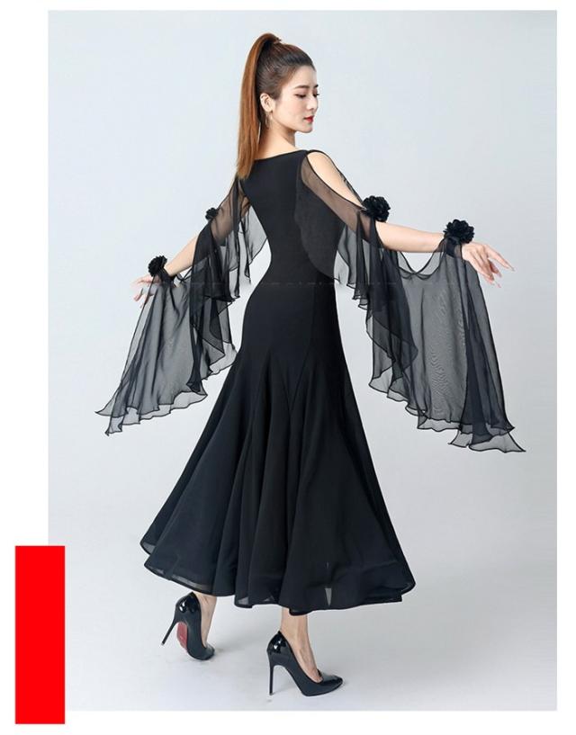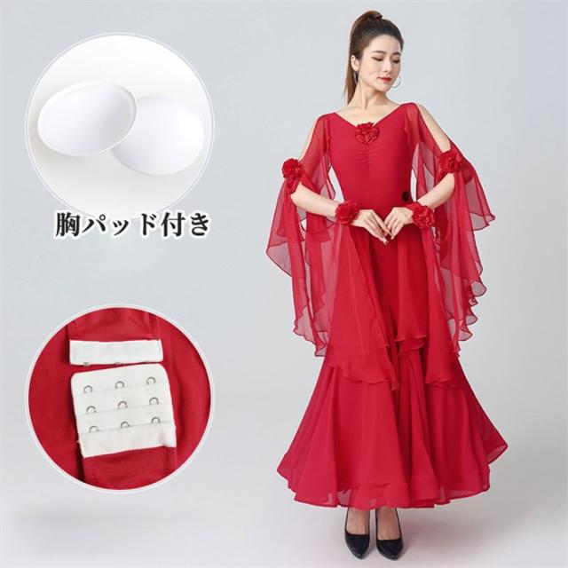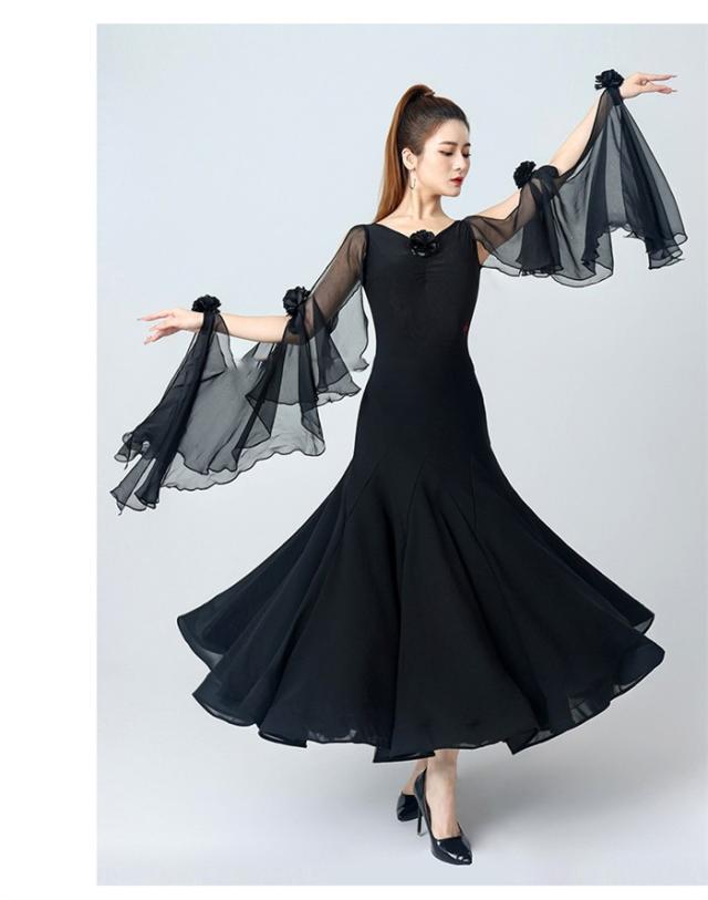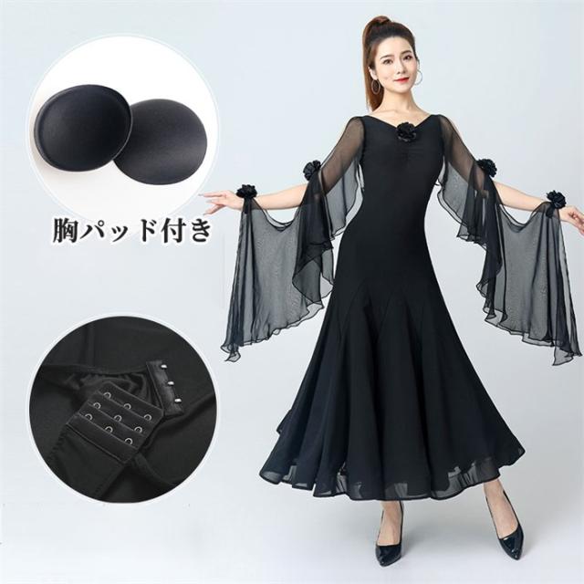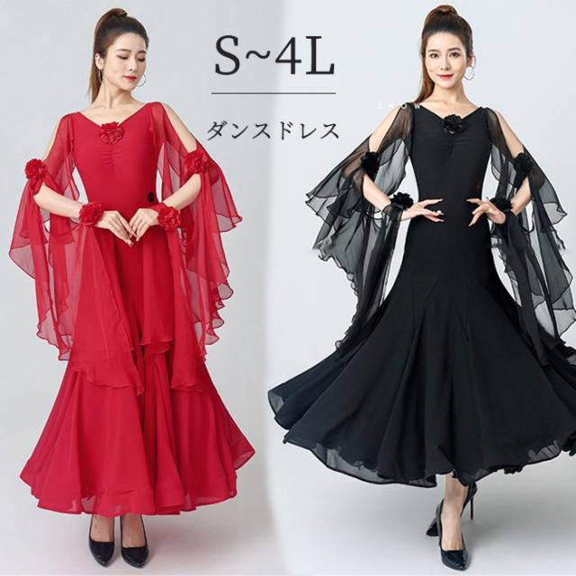 社交ダンスドレス 社交ダンス モダンドレス 黒 赤 大きいサイズ 長袖 大きい裾 スタンダードドレス ワルツダンス ダンスウェア ステージ衣装 競技会 ダンスパーティー 発表会 競技着 練習着 舞台 演奏会 演出 ブラック レッド