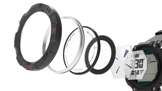 アウトドア活動に役立つトリプルセンサー(方位、気圧/高度、温度計測)とタフソーラーを搭載。