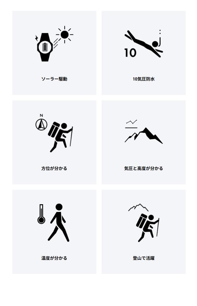 ・高度計測機能/相対高度計(計測範囲:−700 〜 10,000m)、高度メモリー(計測月日・時刻・高度を最大30本マニュアルメモリー、自動記録データ:最高/最低高度、オート積算(上昇/ 下降)メモリー)、登山記録データ14本(最高/最低高度、オート積算(上昇/下降)メモリー)、高度差計測(−3,000〜3,000m)、計測間隔設定機能(5秒/2分毎)※最初の3分間のみ1秒毎