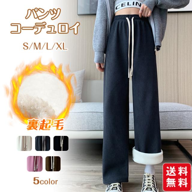 ロングパンツ パンツ コーデュロイ レディース 裏起毛 リブ ウエストゴム 秋冬 カジュアル ハイライズ 楽ちん 無地 裏ボア ワイドパンツ あったか ゆったり 着やせ 寒さ対策 冬 ボトムス ストレート 防寒着 防寒着