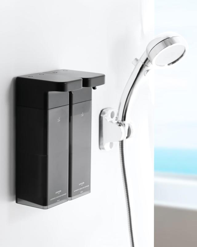 【様々なシーンで活躍】5種類のシールが付いておりますので、ご要望に合わせて容器に貼ってお使いいただけます。清潔感のあるホワイト、スタイリッシュなブラックの2色からバスルームの雰囲気に合わせていただけます。据え置き型だけでなく壁掛け型や両方で使えてバスルームをスッキリ収納させることができます。※黒いスポンジなど深色のものを使うと、センサーが反応しなくなる恐れがあります。色味を変えてお使い下さい。