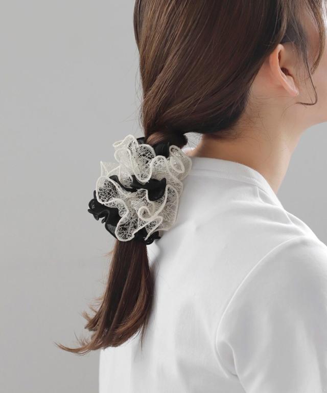 繊細なレースとフリルの組み合わせが、可憐なうしろ姿に仕上げるシュシュ。