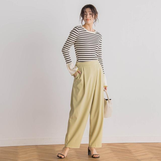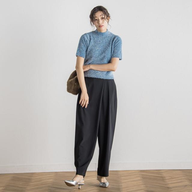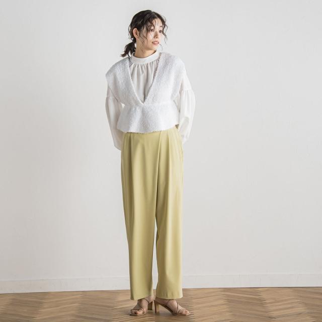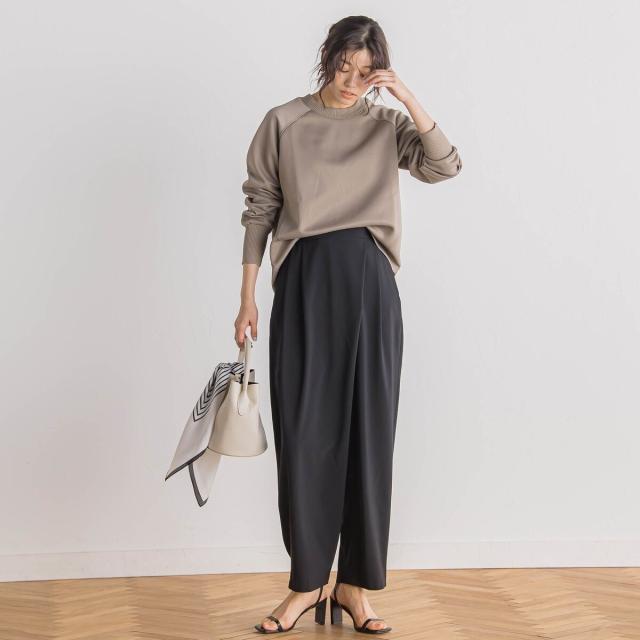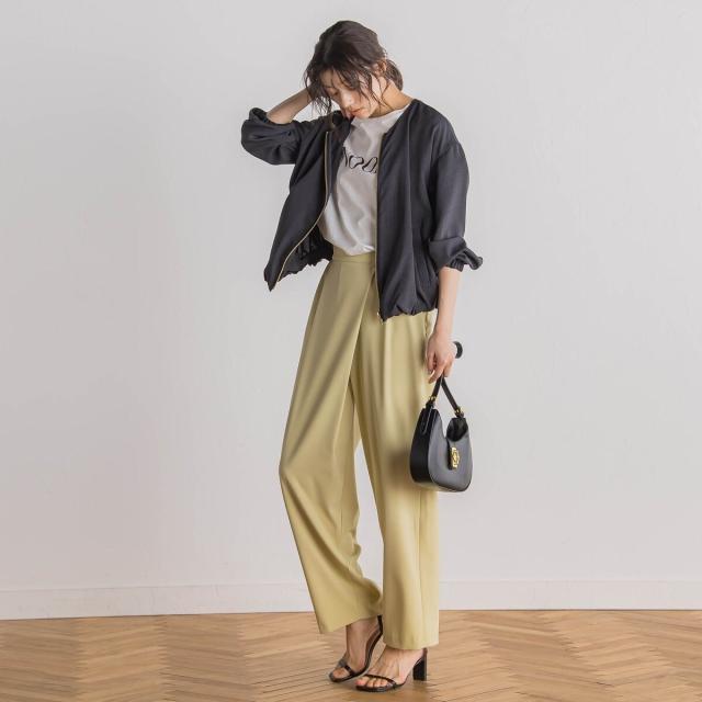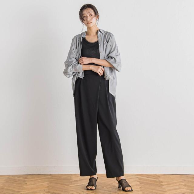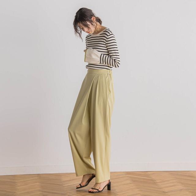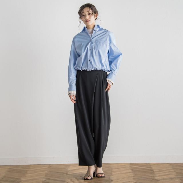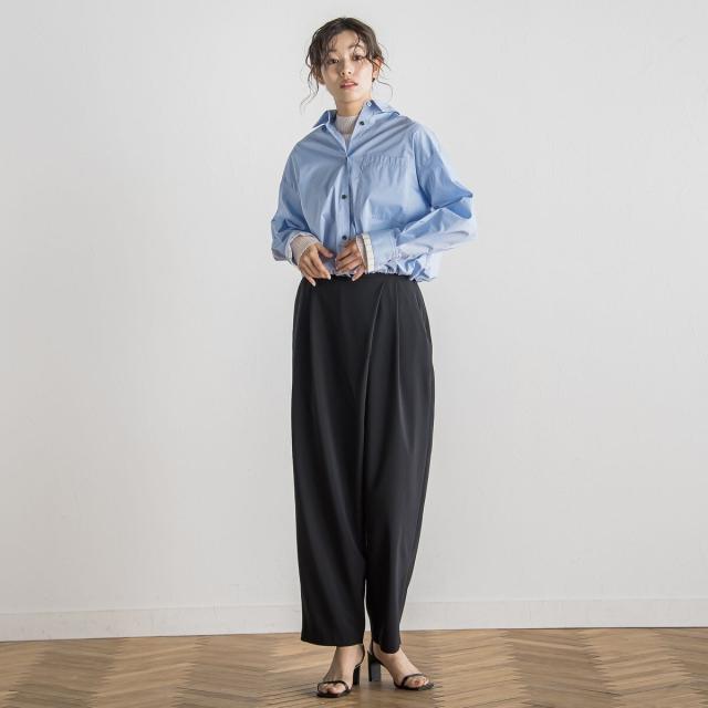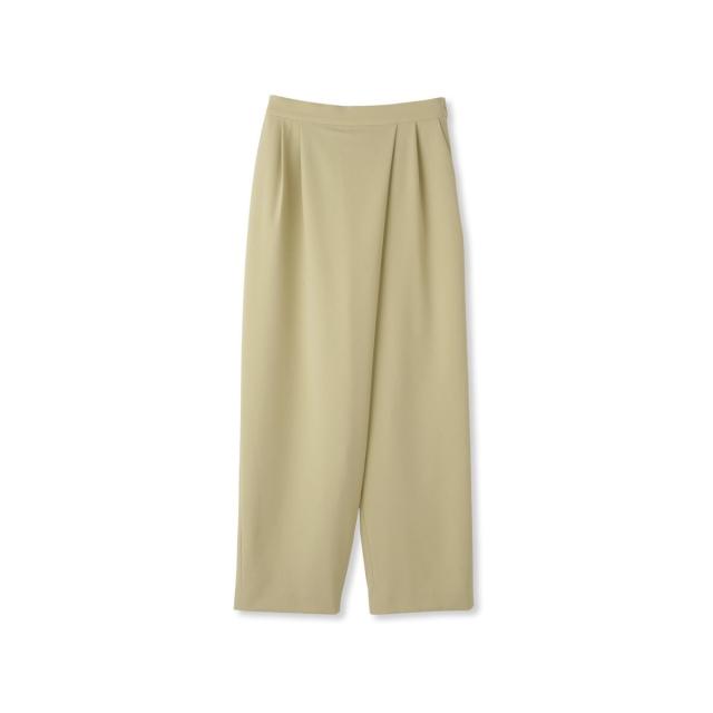 アシンメトリーなラップデザインとゆるやかなカーブのシルエットが着映えを叶える新しいパンツ。