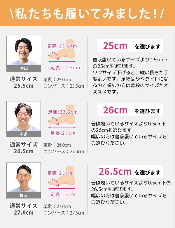 取り扱いサイズ:24.5cm 25cm 25.5cm 26cm 26.5cm 27cm 28cm 29cm 30cm