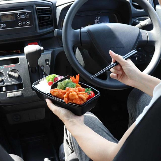 仕事の休憩中に車の中でも手軽にランチを楽しめるよう、手にフィットする形状で設計されています。片手で持って食べるシチュエーションを考えて、底がアーチになっています。