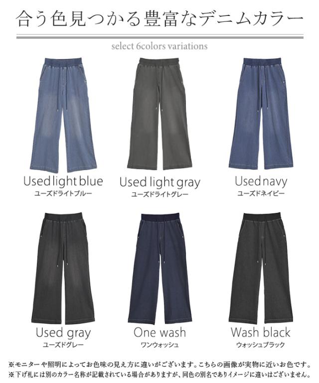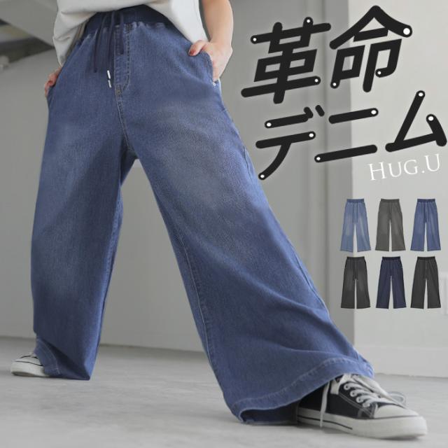 「革命デニム」 デニム スウェット パンツ デニムパンツ レディース ワイドパンツ ワイド ジーンズ ジーパン 体型カバー ボトムス ボトム ストレート ズボン ハイウエスト ウエストゴム ストレッチ 大きいサイズ カジュアル 黒 春 冬 HUG.U 秋新作