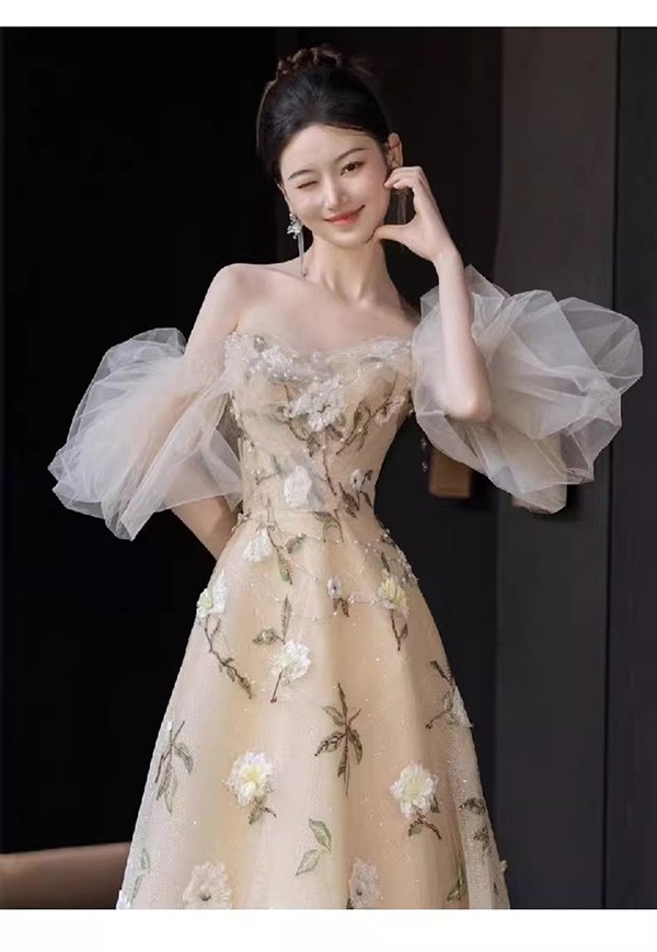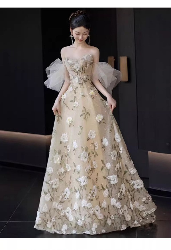 イブニングドレス ロングドレス 花柄 ベージュ袖あり 刺繍 ピアノ発表会 演奏会ドレス ウエディング 結婚式 パーティードレス フォト婚 イベント 演出 舞台 披露宴 ステージ dt001m5