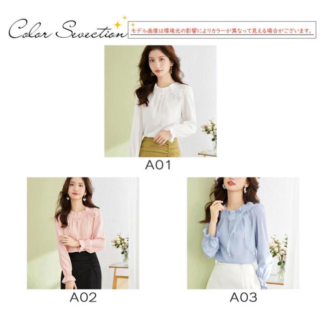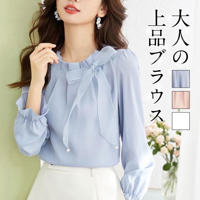 ブラウス トップス レディース 長袖 シフォン フォーマル リボン フリル スタイルアップ 体型カバー シンプル カジュアル きれ