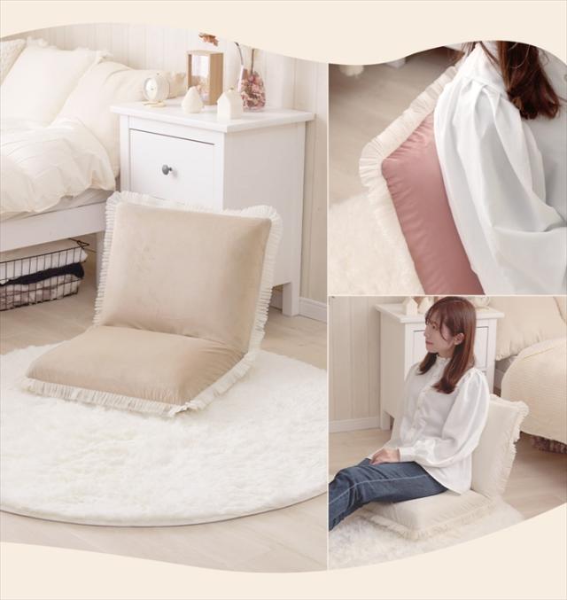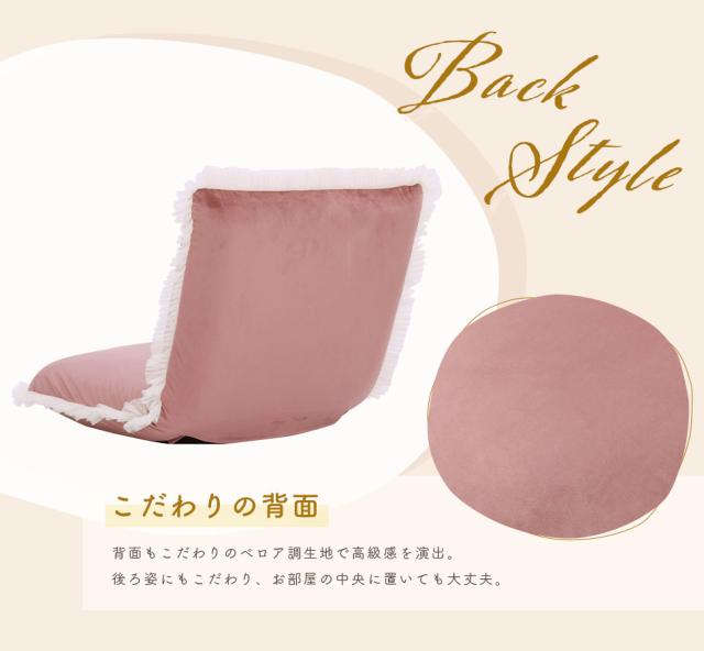 | ・周りについた透け感のあるチュール生地のフリルがかわいい座椅子 ・14段階リクライニング機能付き ・上質な質感のベロア生地を採用 ・安心安全の日本製 |