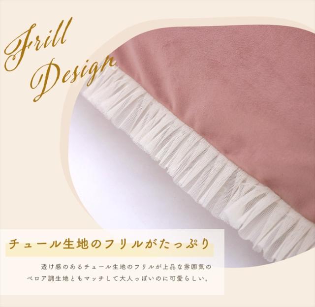 透け感のあるチュール生地のフリルを座椅子の周りにぐるりと施し、ベロア調生地ともマッチして大人っぽいのに可愛らしいを実現しました。