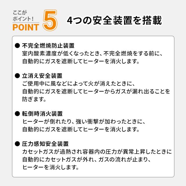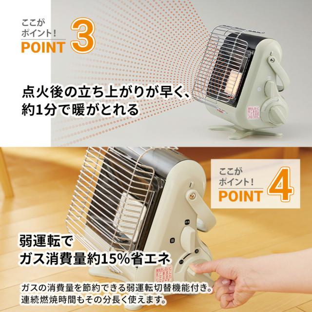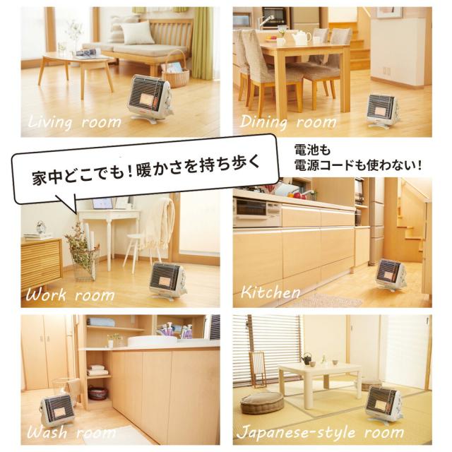 商品詳細 | 電池も電源コードも不要!燃料はカセットガス!! 必要な暖を、必要な場所で、必要な時だけムダなく得られます。 『暖かさを持ち運ぶ!』という、合理的な暖房スタイル。 【弱運転機能】搭載。ガス消費量約15%省エネ ★燃料がカセットガスだから、入手も交換も手軽。交換時に手も汚さず操作も簡単。地震などの非常時にも役立ちます。 ★輻射暖房なので優しい暖かさが得られ、温風が苦手な方にもおすすめです。 ★ホースやコードがないので、足元を気にせず安心して使うことができます。 ★小型・軽量で手軽に持ち運べます。 ★ガスを使い切るヒートパネル搭載。 4つの安全装置を搭載 1.不完全燃焼防止装置 2.立消え安全装置 3.転倒時消火装置 4.圧力感知安全装置 |