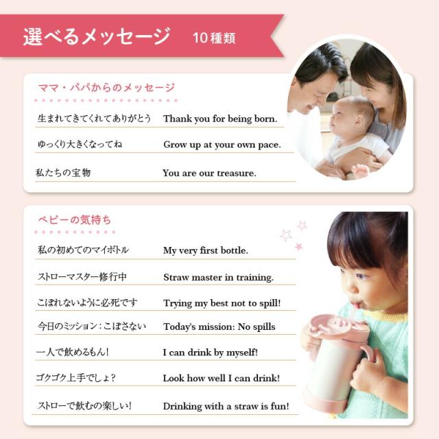 ギフトにもご自宅用にも安心なブランド。 ママパパからのメッセージと イラストが可愛いベビーストローマグ。 1)使いやすさにこだわった新設計 ・飲み口とパッキンが一体の新構造 パーツが少なく、取り付けやすい設計でパッキンの付け忘れも防げます。 ・魔法びん構造 冷たさをキープし、結露もしないので快適に使用可能。 ・押しやすい大きなボタン お子さまでも開閉がしやすく、使いやすいデザインです。 ・フタが大きく開く構造 飲みやすさを追求した設計。 ・シリコーン製ソコカバー 本体が傷つきにくく、滑りにくいので安心。 ・丸洗いOK 凹凸が少ないパーツで簡単に洗え、衛生的に保てます。(※本体は水中に放置しないでください) 2)選んで楽しいカスタマイズ ・名入れ対応 本体にお子さまの名前を彫刻して特別感をプラス。 筆記体のおしゃれな仕上がりです。 ・選べるメッセージ10種類 ママ・パパからの温かいメッセージや、 ベビーはきっとこんなこと思いながら飲んでいるのかな?と感じるベビー視点の可愛らしいメッセージを選べます。 ・シンプルイラスト45種類 今っぽい雰囲気にこだわった 当店専属デザイナー書下ろしイラスト。 ベビーはもちろんママも嬉しい大人可愛いテイスト。 3)便利な付属品と高品質なデザイン ・交換用ストローセット付属 飲みやすいシリコーン製の飲み口で、簡単に交換可能。 ・耐久性のある高品質素材 丈夫な作りで、赤ちゃんの成長に寄り添いながら長くお使いいただけます。 ・フラットなフタデザイン お名前シールが貼れるフラットなデザインで、さらなるアレンジも楽しめます。(※お名前シールは付属していません) 《こんな方におすすめ》 ・ベビーストローマグ トレーニングマグ をお探しの方 ・赤ちゃん用水筒 ベビー用水筒 子供用水筒 として ・保冷ができる ベビー用マグ を検討中のママ・パパ ・出産祝い、誕生日プレゼントに特別な名入れギフトを贈りたい方 ・幼稚園 保育園 で使える赤ちゃん用 水筒として ・長く使える乳児向けトレーニングマグをお探しの方 ・安全でおしゃれなデザインを重視するご家族 |