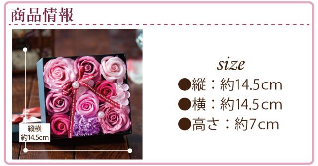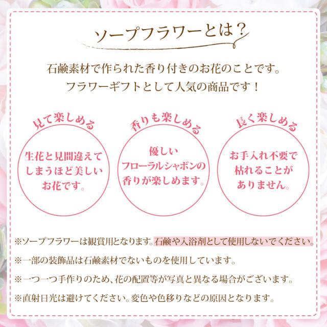 | お花 | ・ソープフラワー「スクエア」 ※一つ一つ手作りのため、花の配置や装飾品の色等が写真と多少異なる場合がございます。 ※ソープフラワーは観賞用のため、石鹸や入浴剤として使用しないでください。 ※一部の装飾品は石鹸素材でないものを使用しています。 ※香りは時間とともに薄れていきます。ご了承ください。 |