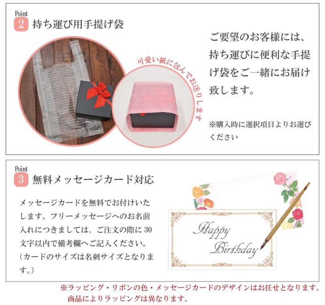 | ギフト対応 | ・個別メッセージ対応。 ※ご希望の際は、備考欄に30文字以内でご記入ください。 ・ラッピング対応 オプションでお選びください。 |
