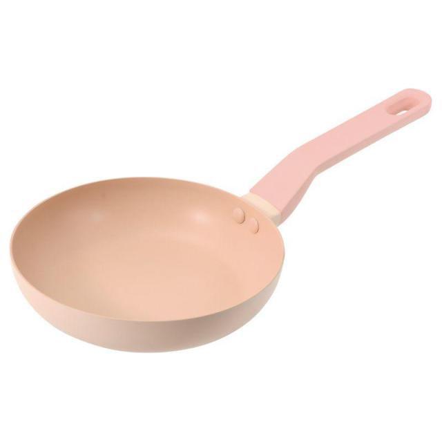 〇フライパンはこびりつきにくくお手入れ簡単な、独自のペールピンクふっ素コーティングを採用