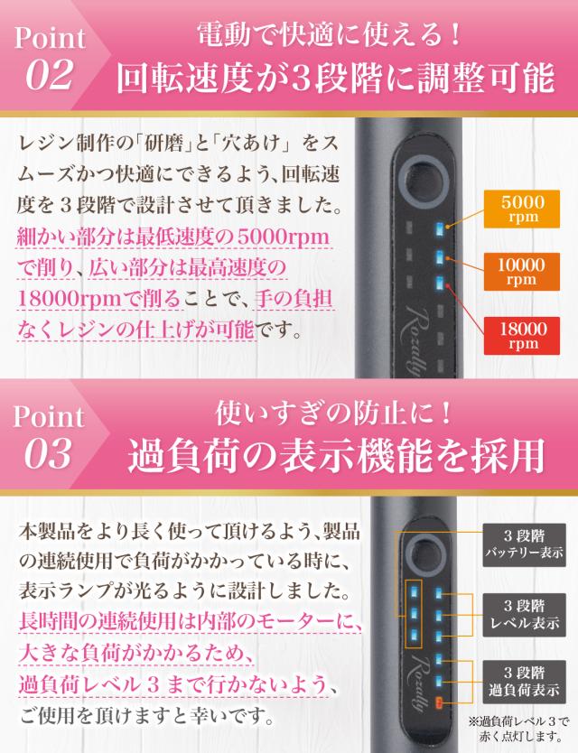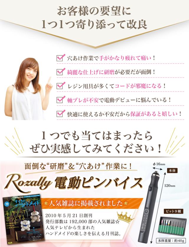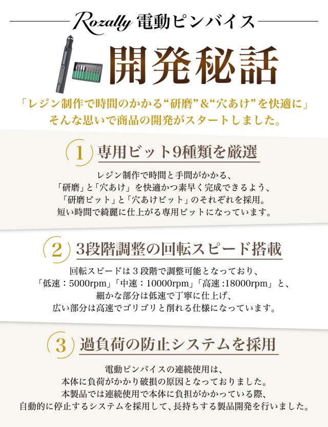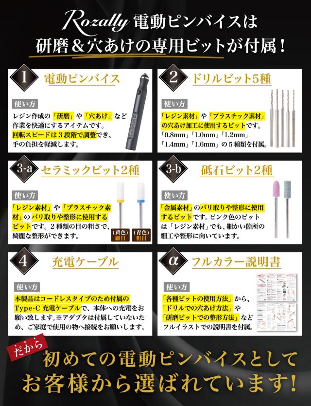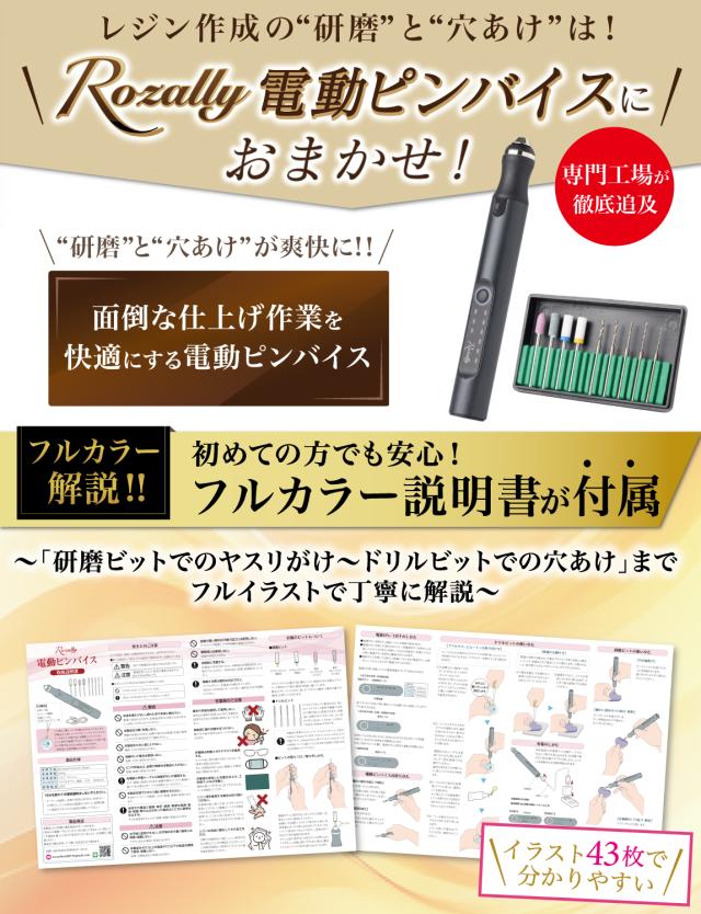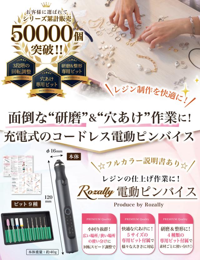 Rozally 電動ピンバイスセット ( 電動 ピンバイスセット ) がついに正式販売開始。 「レジン の 穴あけ を時短したい」「仕上げ用の研磨を快適にしたい」という お客様に人気のUSB 充電の コードレス の 電動ピンバイスです。 「手動のピンバイスだと手が疲れる…」「研磨やすりだと凄く時間がかかる…」 そんなお客様の声から生まれた電動で快適にレジンを楽しめるピンバイスセットです。 |