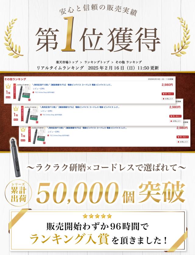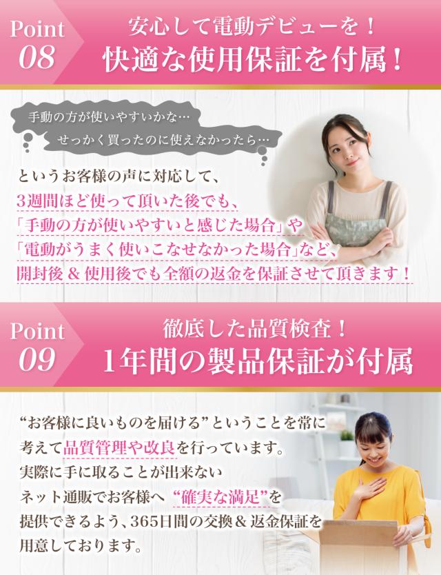 Rozally 電動ピンバイス は品質にこだわり、 工場と交渉をおこなってコードレスタイプの設計で進めています。 出荷前の検品などは十分に行わせて頂いているのですが、 輸送中に破損や汚れの付着など稀に発生してしまうケースがあります。 不具合などが発生してしまった場合でも、 製品には1年間の長期保証を付属させて頂いておりますので、 すぐに交換品の手配をさせて頂きます。 また本製品には効果を実感して頂くことを最優先に考え、 「2週間ほど使用しても快適さが全く実感できなかった」という場合に、 ”開封後”でも”使用済み”でも全額の返金保証を付属させて頂いております。 |