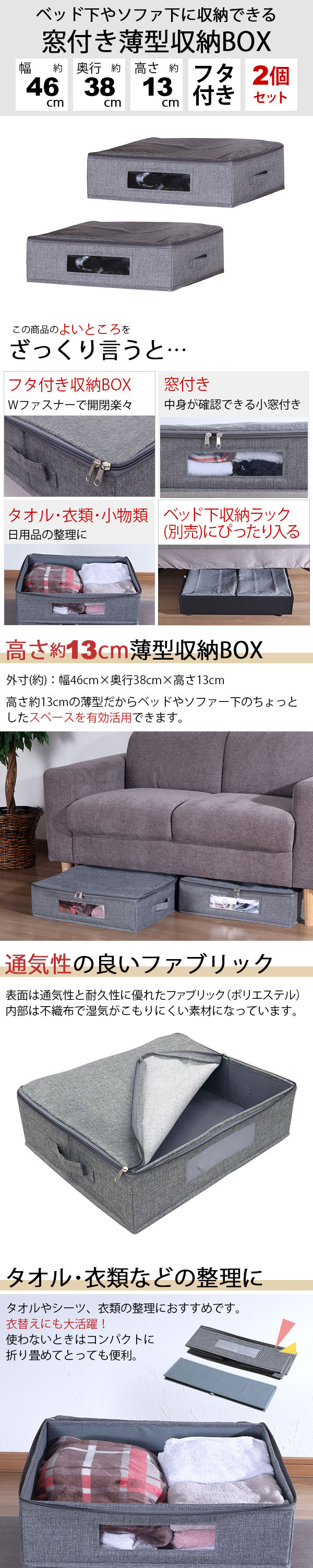 ベッド下収納 2個セット ふた付き 取っ手付き 幅46cm 奥行38cm 高さ13cm 衣類 収納ケース 中身が見える 収納ボックス 薄型 46×38 ベッド下 収納 おしゃれ 窓付き 収納ボックス 隙間収納 衣装ケース 布製 スリム ファスナー付き ホコリ対策 軽量 インナーボックス グレー