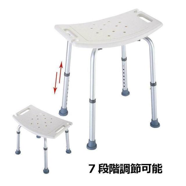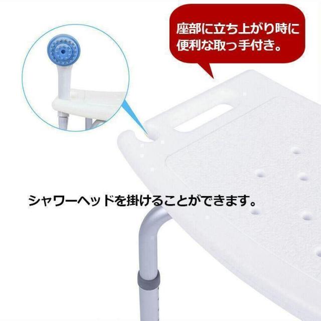 ■商品紹介■座部高さ調節可能なシャワーチェアー、安心&便利な取っ手付きなだらかなカーブを描いた座面は、お尻にフィットし快適な座り心地を実現します。脚についているボタンを押しながらスライドさせれば7段階でお好みの高さに調整することができ、また足部分には滑り止め用の吸盤も付いており、安全にお使いいただけます。座面には12個の水切り穴が開いており、水が溜まりにくい構造になっているので防カビもバッチリです。耐荷重は136kgとなっており、体が大きな男性にも安心してお使いいただけます。