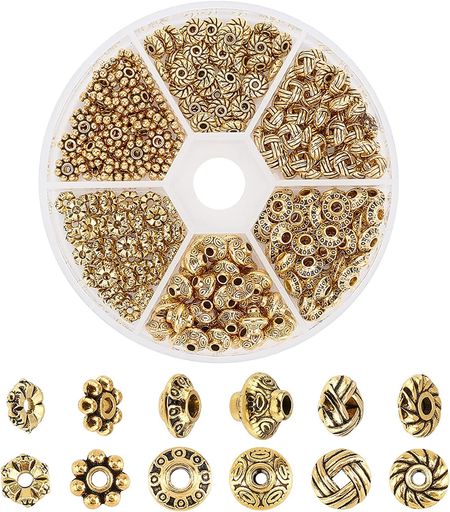 ?サイズ:スペーサービーズ:6x3.2mm、穴:2mm、50個;スペーサービーズ:5.5x2mm、穴:1 mm、50個;スペーサービーズ:6x6x2mm、穴:1.5mm、50個;スペーサービーズ:6x2mm、穴:1mm、50個;スペーサービーズ:6.5x4mm、穴:2mm、50個;スペーサービーズ:6.5x7.5mm、穴:1mm、50個;保管容器:8x2cm、1個。
