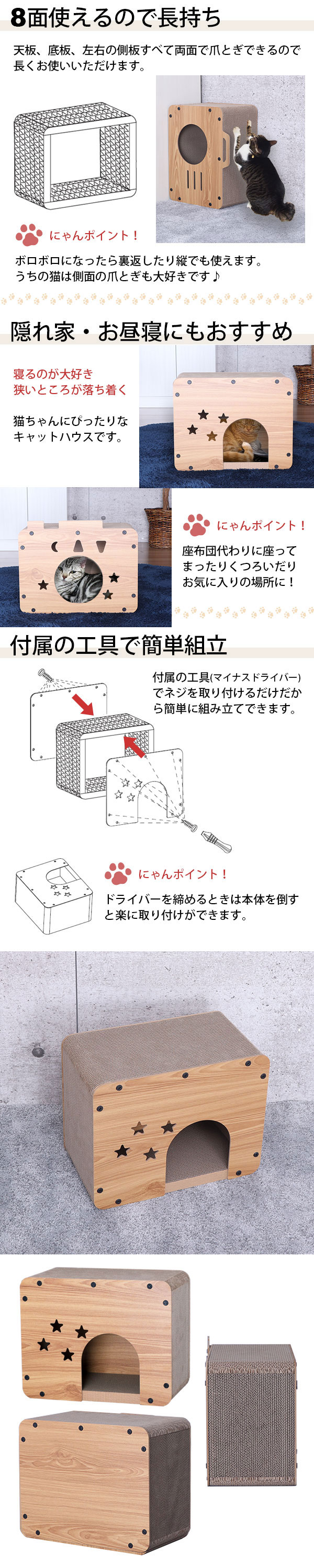 天板、底板、左右の側板すべて両面で爪とぎできるので長くお使いいただけます。