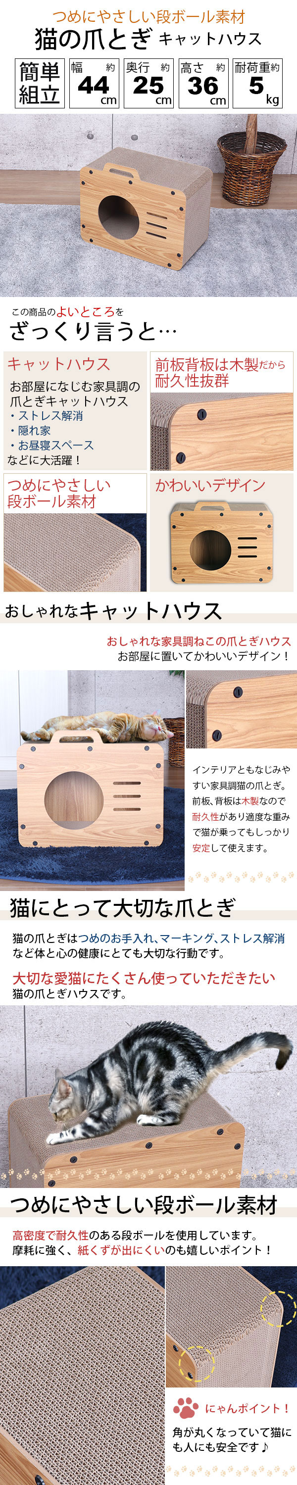 商品名:猫ハウス キャット ハウス 爪とぎ (約)45幅 ペット ハウス 室内用 おしゃれ 猫 ハウス 段ボール 爪研ぎハウス ねこ ベッド 猫 隠れ家 丈夫 コンパクト 猫用ハウス 猫家具 キャットハウス 紙くずが出にくい 幅44cm 奥行25cm 高さ36cm かわいい カメラ型 木目調 ナチュラル