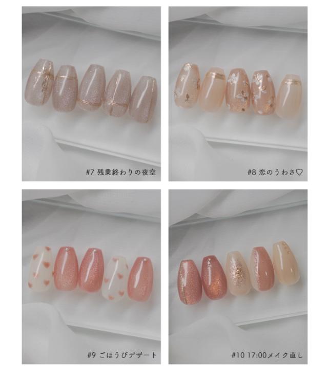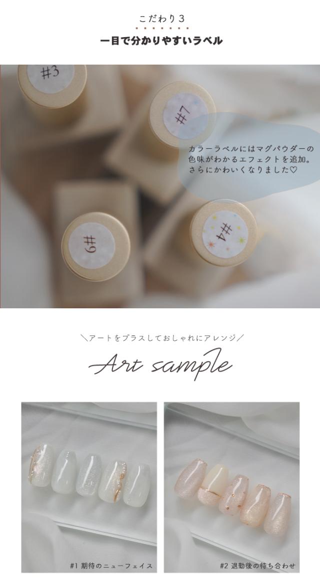 | 注意事項 | ・本製品は化粧品ではありません。ベースジェル(化粧品)の上からご使用ください。 ・ラベルシールの印刷のずれや、手作業でラベルシールを貼り付けているため、貼り付け位置にずれが生じる場合がございます。 ・当店取り扱いのUV/LEDライトに対応しています。 ・塗布量や撮影環境、モニターによって、色味の見え方が異なる場合がございます。 |