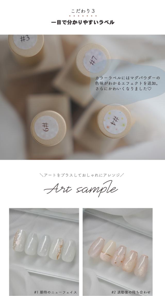 | 注意事項 | ・本製品は化粧品ではありません。ベースジェル(化粧品)の上からご使用ください。 ・ラベルシールの印刷のずれや、手作業でラベルシールを貼り付けているため、貼り付け位置にずれが生じる場合がございます。 ・当店取り扱いのUV/LEDライトに対応しています。 ・塗布量や撮影環境、モニターによって、色味の見え方が異なる場合がございます。 |