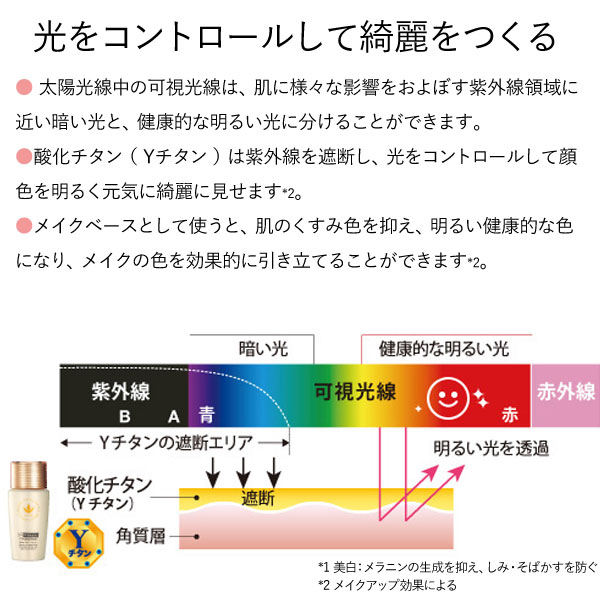 酸化チタン(Yチタン)は紫外線を遮断し、光をコントロールして顔色を明るく元気に綺麗に見せます(※2)。