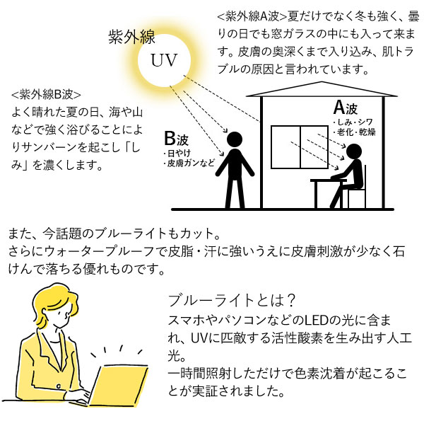 紫外線(UV)は太陽光線の一部で、可視光線より波長の小さな目に見えない光です。強力なエネルギーをもっていて様々な影響を及ぼします。紫外線は波長により、UVA波とUVB波に分けられます。UVA波は夏だけでなく冬も強く、曇りの日でも窓ガラスの中にも入って来ます。皮膚の奥深くまで入り込み、肌トラブルの原因と言われています。UVB波は、よく晴れた夏の日、海や山などで強く浴びることによりサンバーンを起こし「しみ」を濃くします。