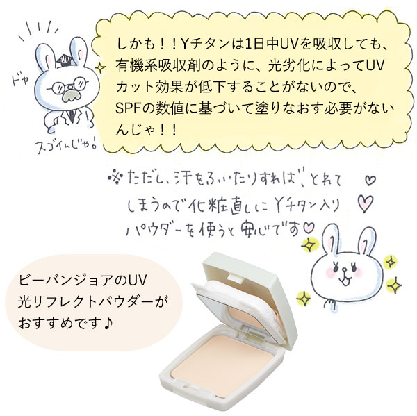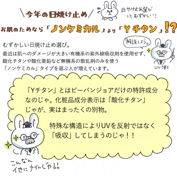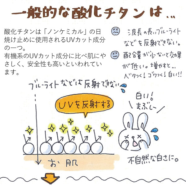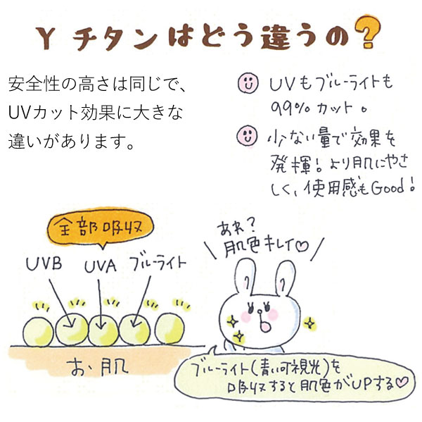 酸化チタン(Yチタン)がUVA波・UVB波を遮断し、日やけを防ぎます。