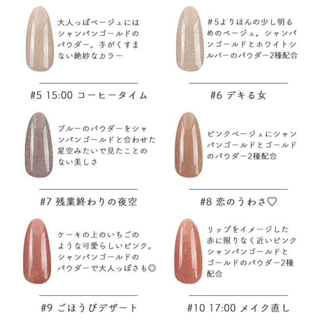 ジェルの色合い、パウダーの種類から配合量。