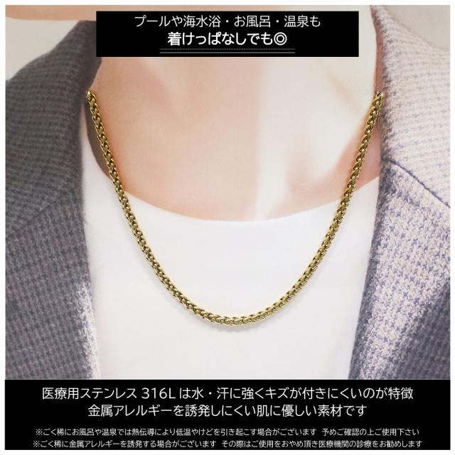 スクリューチェーンをダブルで編み込むことで重厚感がプラス。水・汗に強いステンレス316Lは、装着したままでも海やプール、温泉などにも入水できます。キズが付きにくいので、お手入れなしでもいつまでも輝きが持続します。金属アレルギーを誘発しにくい肌に優しい素材です。