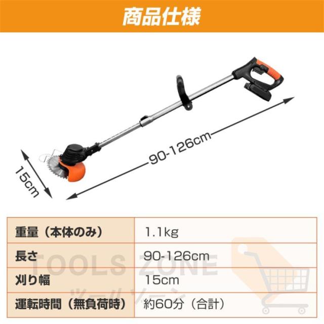 - 迅速な対応ありがとうございます。 本日、充電式草刈り機届きました。 今まで広い場所の草刈りをガソリンエンジンの草刈機を使用していましたが、 庭の狭い場所の草刈りにと充電式の草刈機を購入しました。購入にあたっては コンパクトで値段も安価なので心配でレビューなど参考に高評価の当草刈り機 の購入を決めましたが、現品を見るまで心配でした。 品物が届き、簡単に組み立てもできさっそく作動確認しました。 まず驚いたのは、当初予想してたよりもパワーがすごく感じました。次に、ナイロン ブレードをつけ草刈りを行ってみましたが、小石が多い庭なので慎重にしましたが、 かなり草を刈ったとき、ブレードが割れてしまいました、これは当初たも予想してい たもので想定内のものです。その後スチールブレードに変え残りを刈りうまくいきま した。今後も他のブレードも使いうまくいくものと思います。 バッテリーも30分 程度使用できました。 その他不備な点もなく大変満読しています。