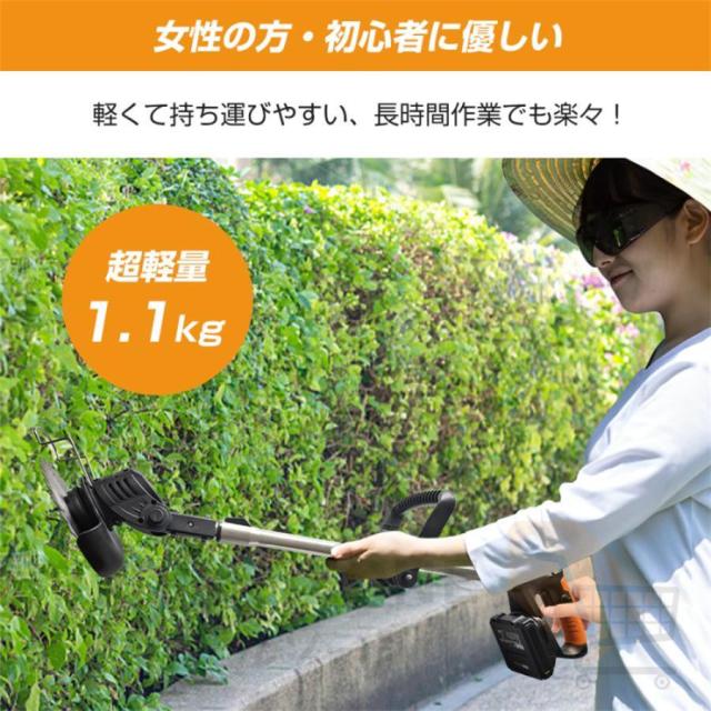 軽量設計で作業がラクラク!枝の剪定、雑草や芝生のお手入れにぴったりの軽量設計のコードレス草刈り機です。軽いので腕が疲れる事なく、女性やご高齢の方でも作業が楽に進みます