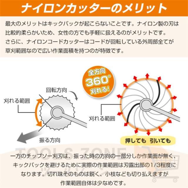 3種類の草刈り機 替え刃:草刈機電動キットは3種の替え刃(ナイロンブレード、金属ブレードとのこぎり刃)付なので、使用環境に応じて刃先を交換することができます。ナイロンブレードは、薄く柔らかい雑草を刈る時に、金属ブレードとのこぎり刃は太い枝や細い枝を切る時に使えます。いろいろな状況で、とても役に立ちます。補助ハンドルは上下に調節ができ、斜面でもらくらく垂直方向に走行させつつ除草ができます